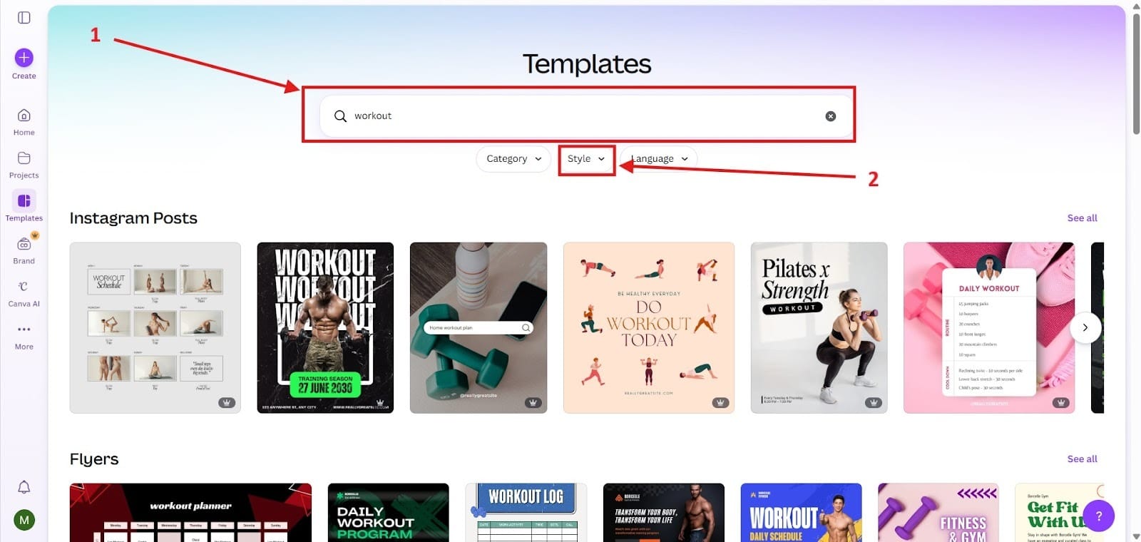 - Create Instagram Workout Posts: One of the cool things about Canva is that it has workout templates on it that will let you customize your brand. To type in “Workout” into the search bar, highlighted as Red Box 1. Next, go to the style box highlighted as Red Box 2 where it will give you different types of styles.