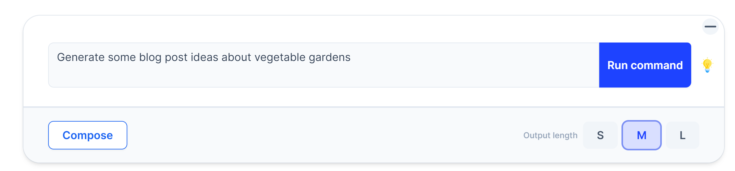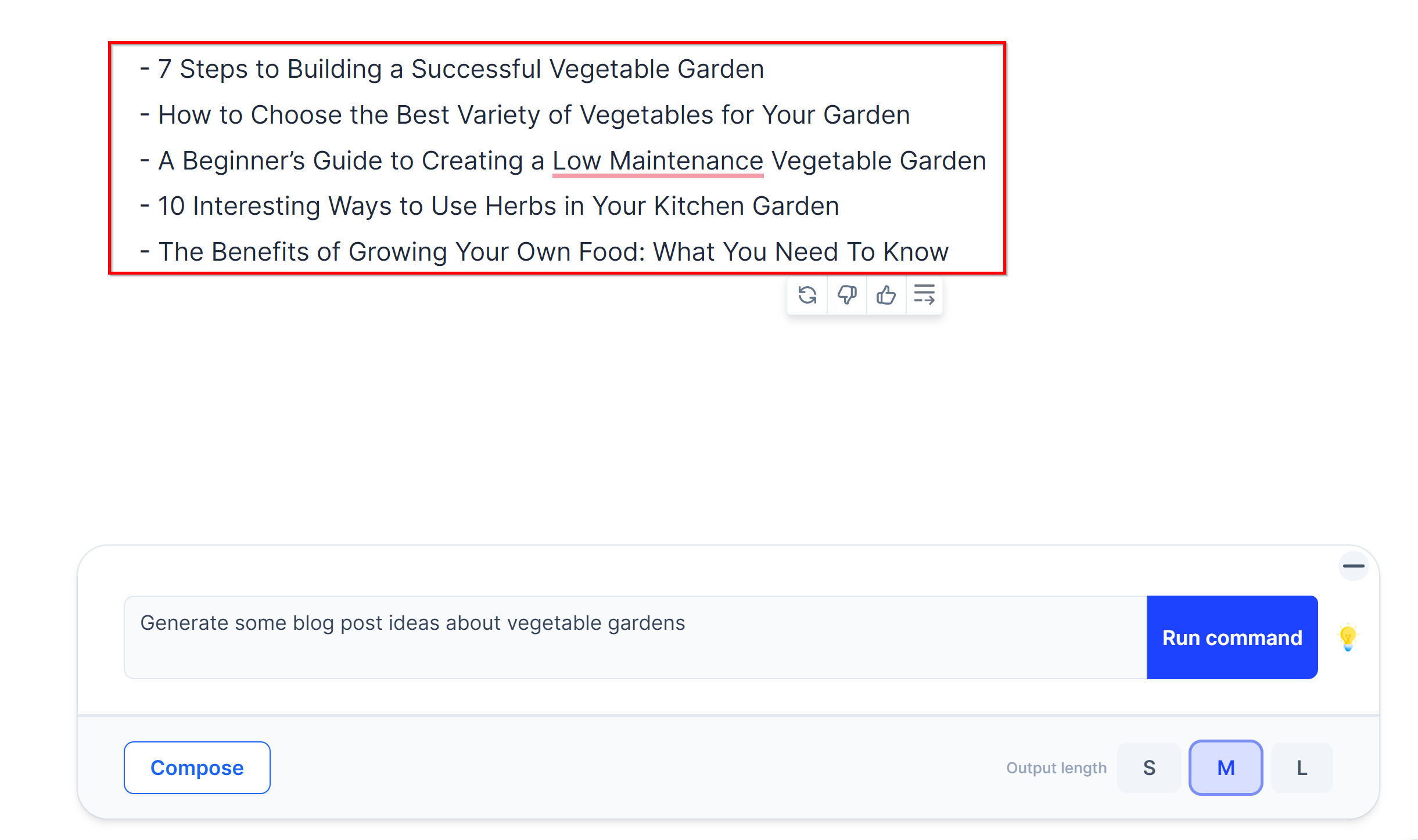 Now let’s try to use commands to create a complete long-form blog post. Suppose we’re making a blog post about vegetable gardens from scratch. The following command will trigger Jasper to give us some title ideas for our blog.
