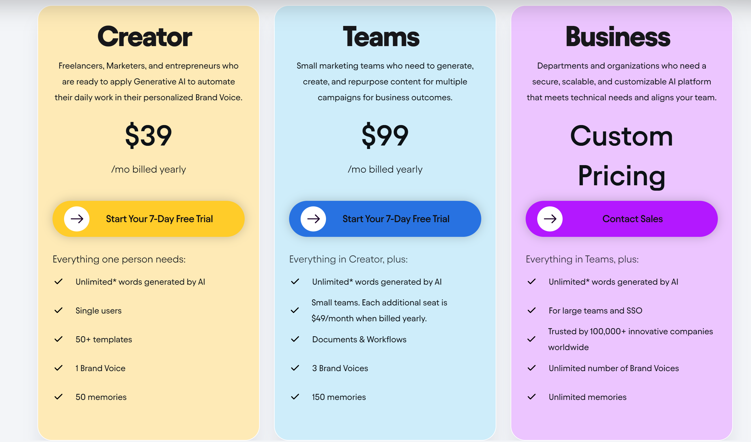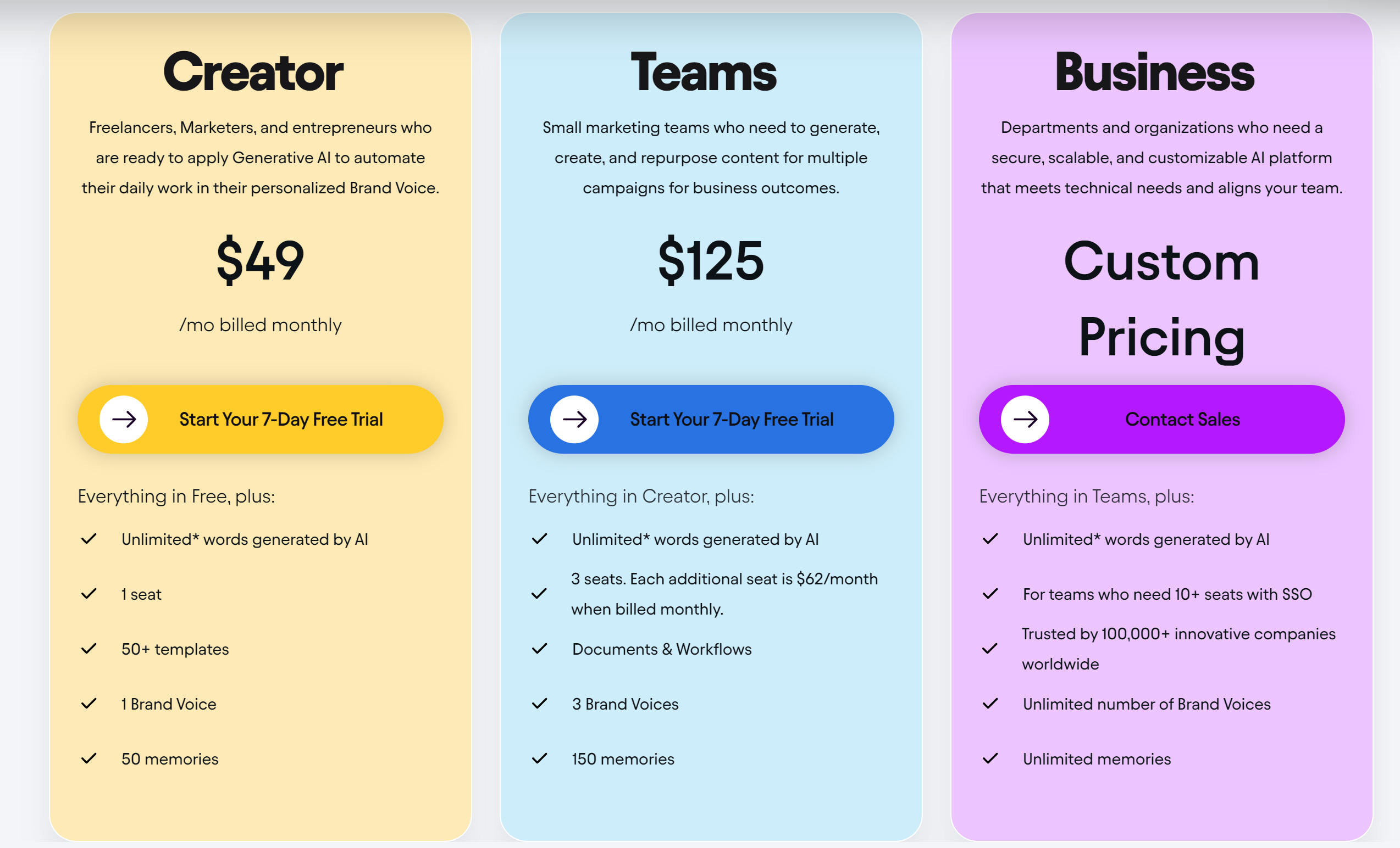 Jasper AI offers pricing plans that cater to the writing demands of various types of users.