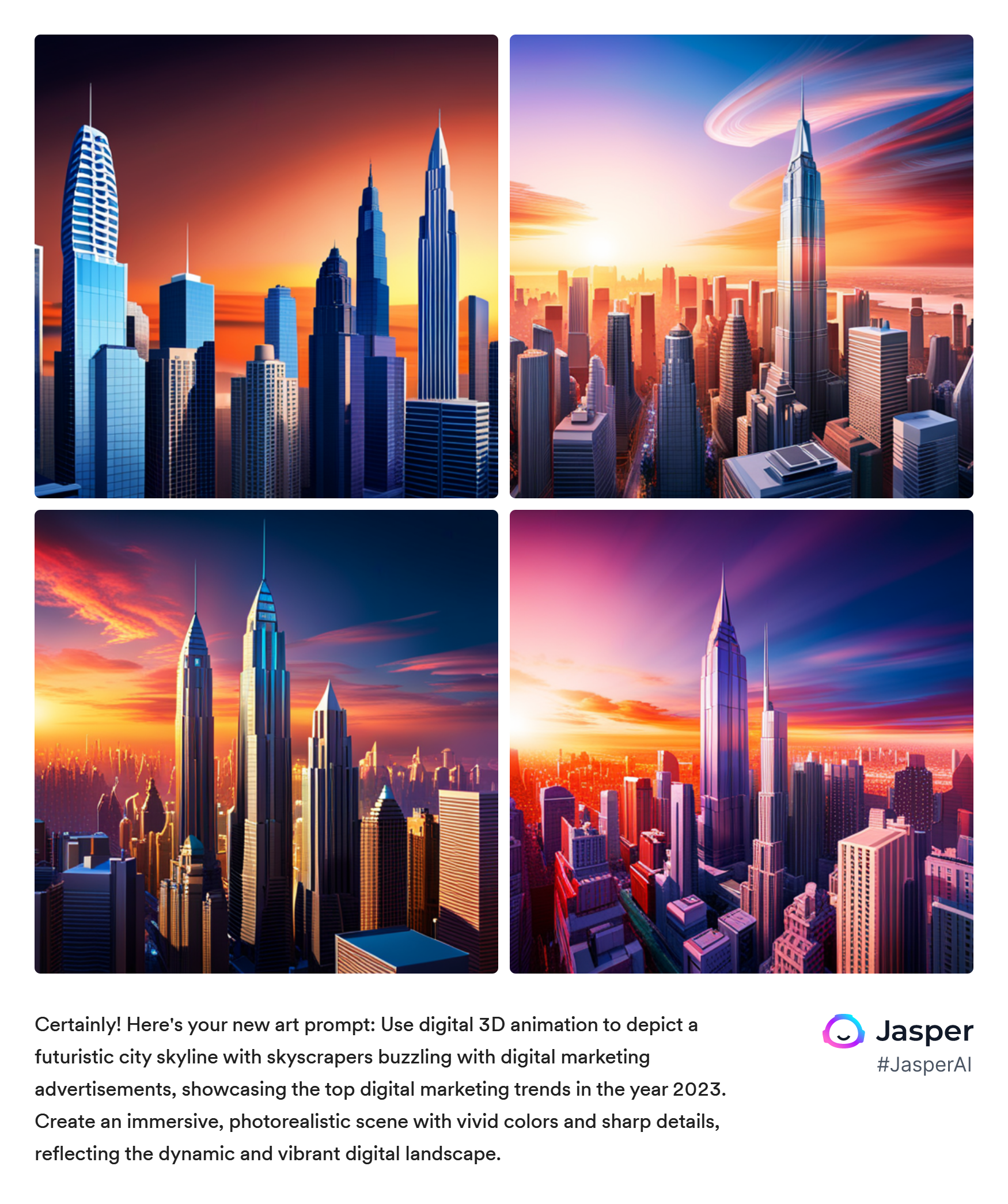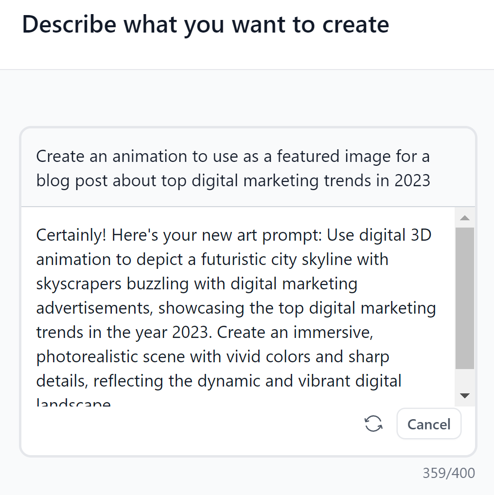 Let's say you've written a blog post about Digital Marketing Trends and wish to create a featured banner image for your blog post. You can go and type "Create an animation to use as a featured image for a blog post about top digital marketing trends in 2023."