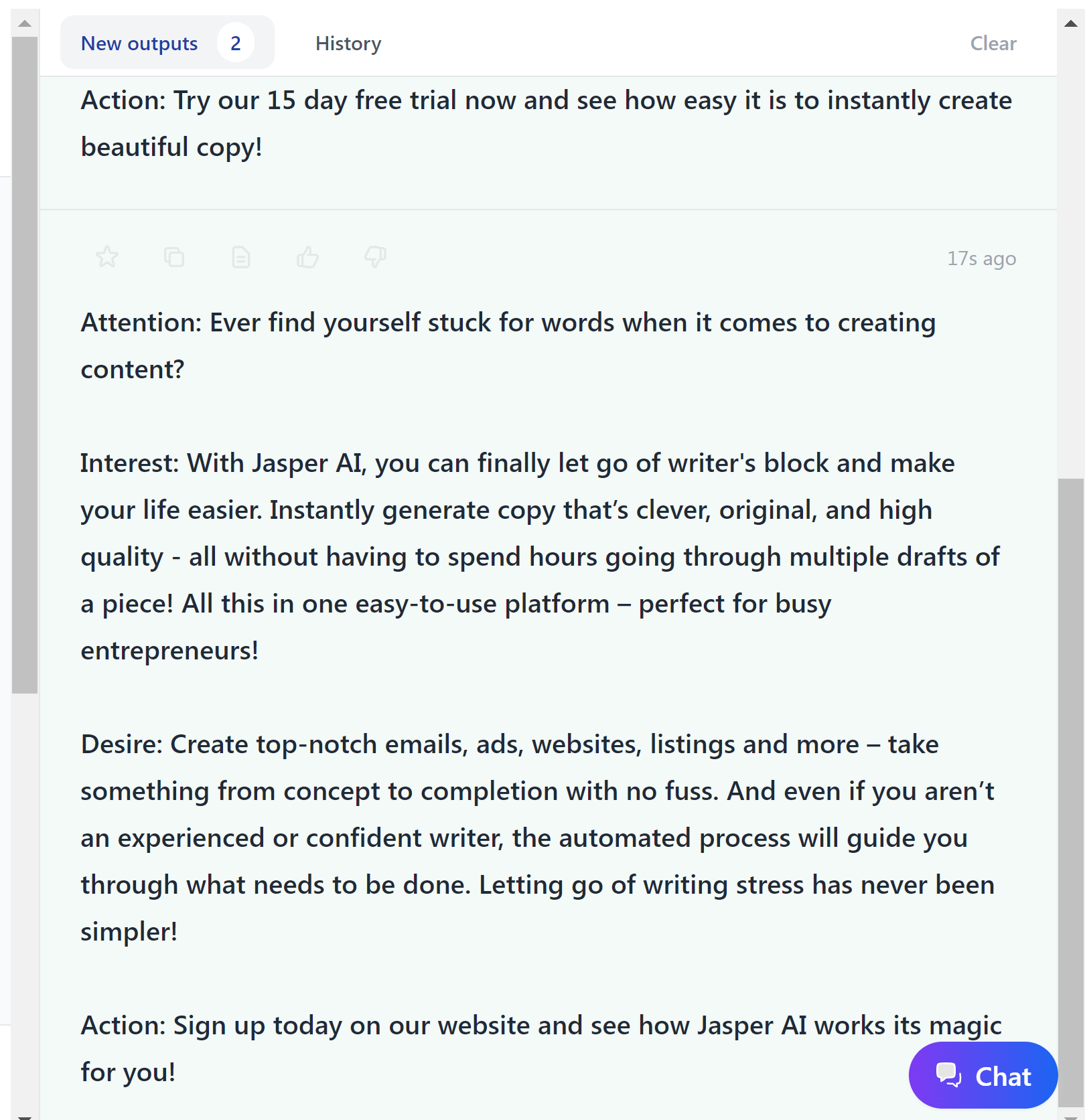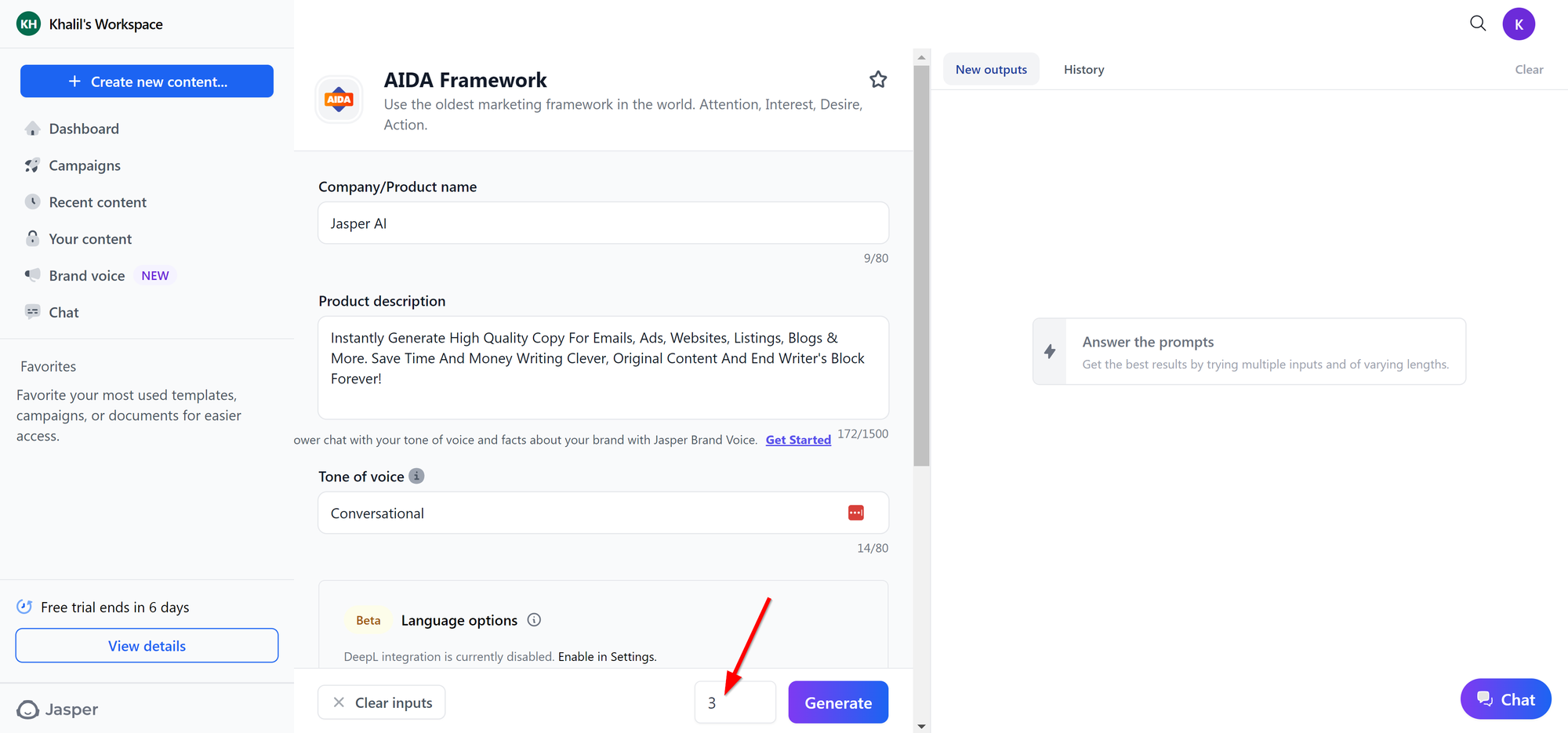 But I also want Jasper to generate three versions of ad copy for me, so I need to set the number of outputs to 3. Finally, I can click on the “Generate AI Content” button to prompt Jasper to do his job. In the example below, I tried creating a similar ad copy for Jasper itself.