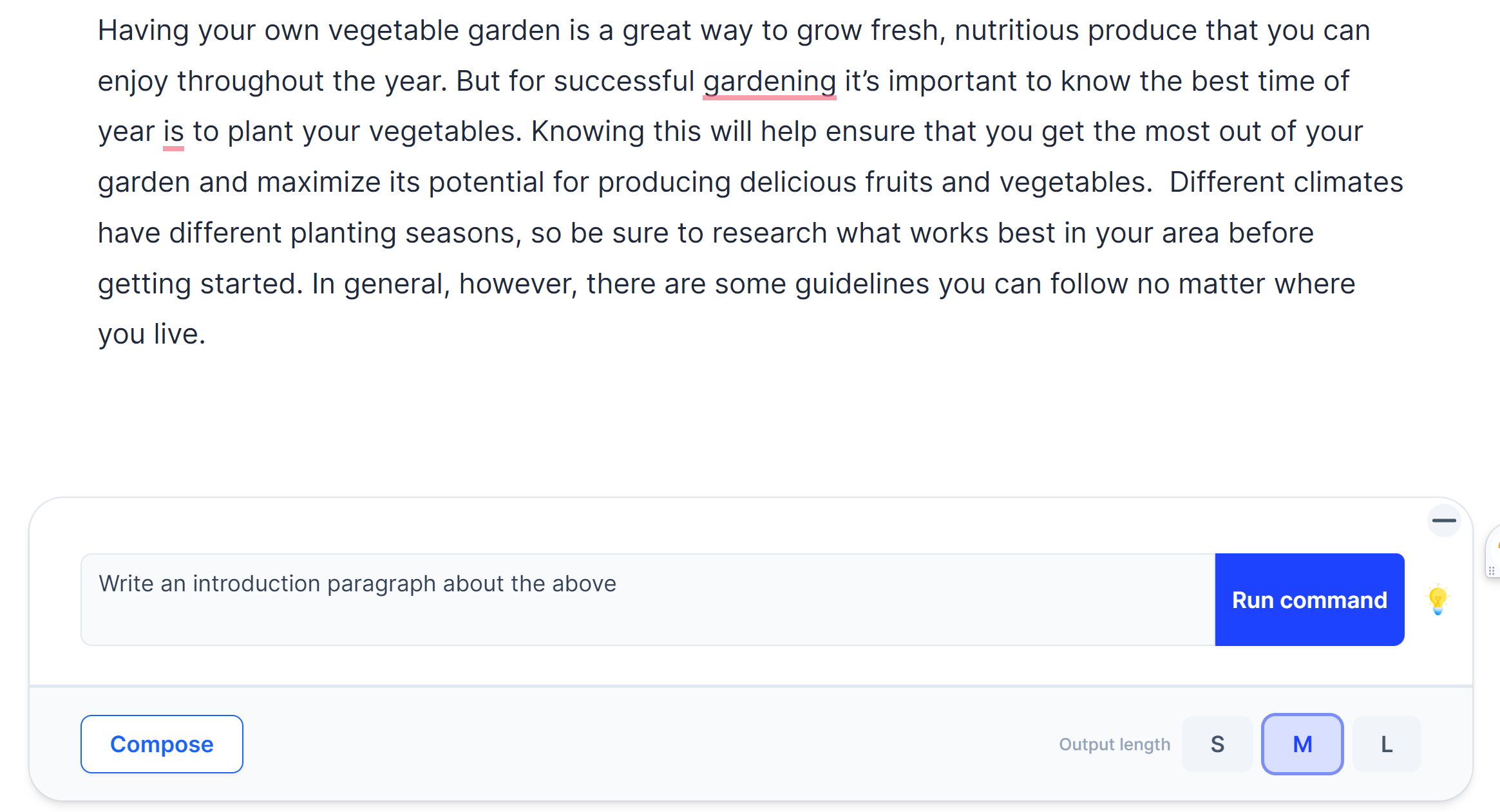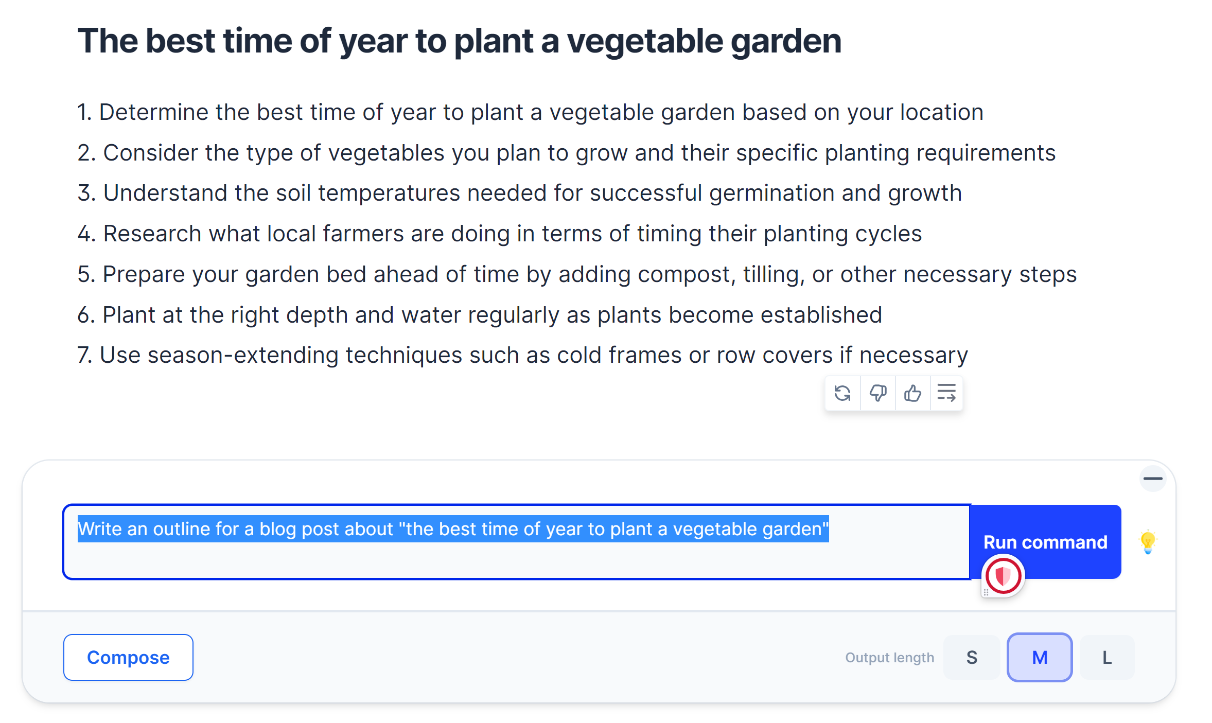 Let’s pick the title, “The Best Time of Year to Plant a Vegetable Garden”. This time we want some key points to write about for that specific title. So, let's run a new command and get a blog outline.