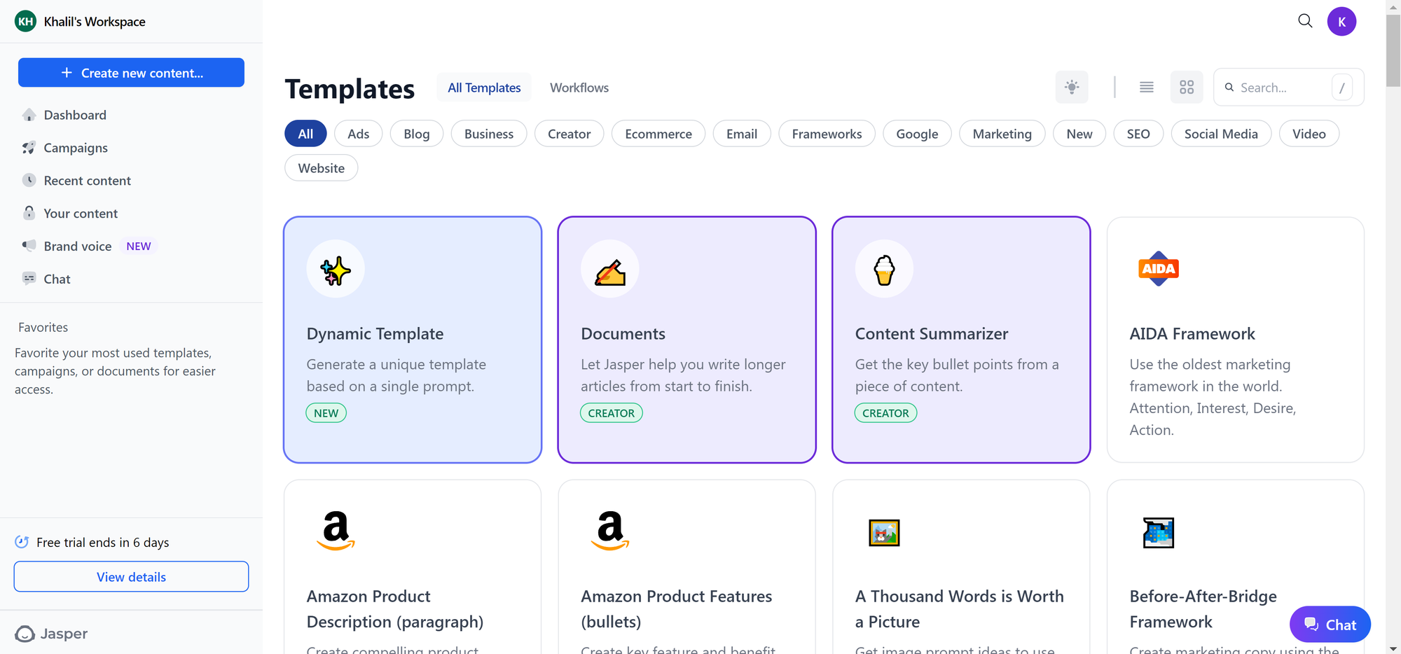 Jasper AI also provides customizable, pre-designed templates and workflows for you to automatically write content for various situations and purposes.
