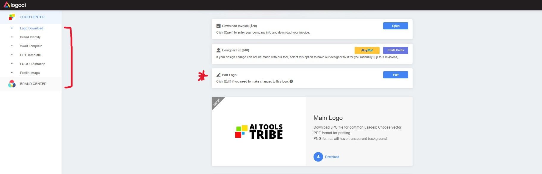 The next screen grab shows you the options (on the left-hand side) to create a brand identity, word documents, PPT templates, animate your logo, and create a profile image.