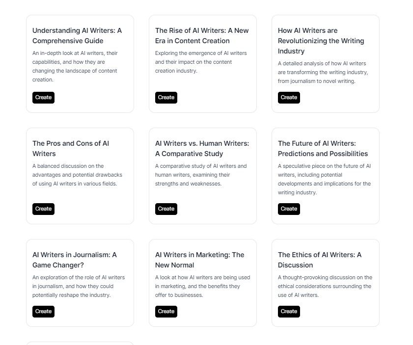 You can click on the "Create" button under any of these suggestions and it will take you to the Moonbeam Wizard, where you can generate the article outline (same process as the above example: "Short Blog on how to select an AI writer for copywriting"). The final step is that the outline/subheadings get filled in and before you know it you have a complete article!