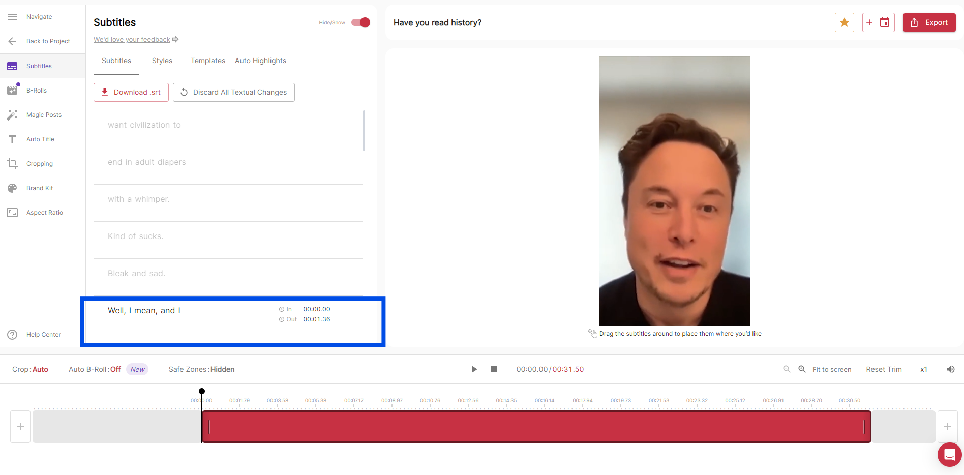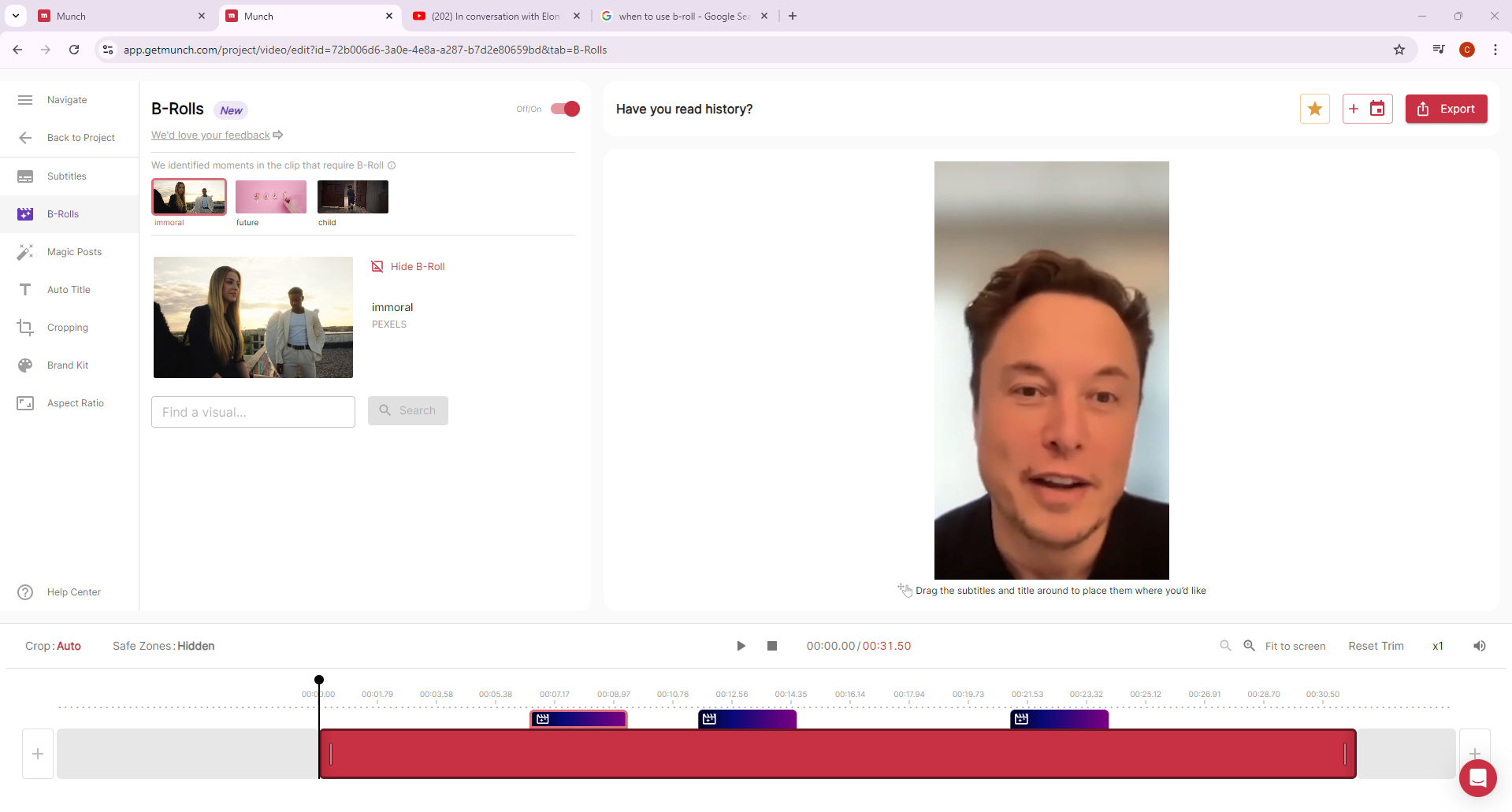 In the screenshot above, you see the available B rolls, and you can choose from 3 different options. Choose the one that you want, and it will play over the video with Elon Musk with the subtitles rolling.