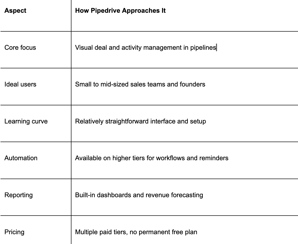 Pipedrive fits small to mid-sized teams that want structure around their sales process without the overhead of a heavyweight enterprise CRM. It works well for: