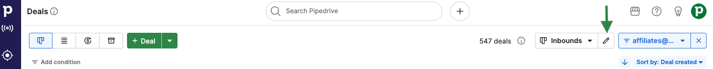 - Go to the pipeline view under deals and click the pencil icon next to the pipeline name to open pipeline settings.