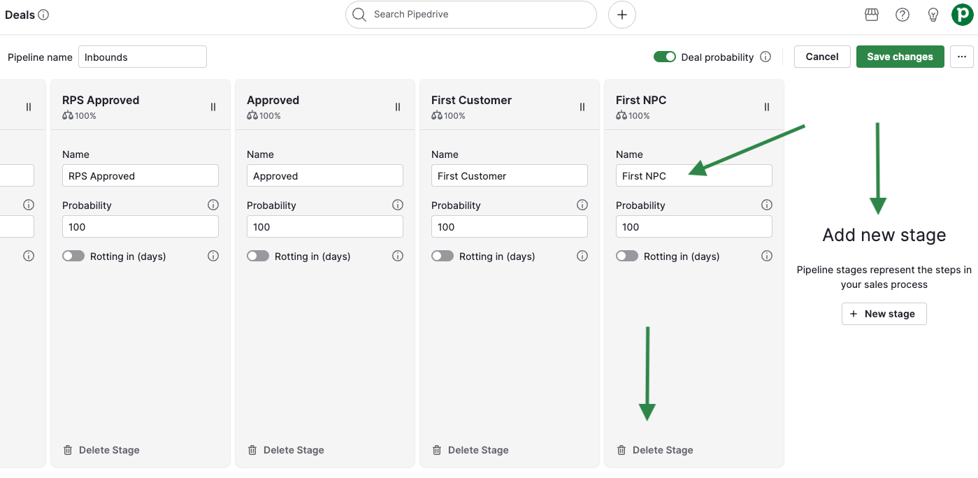 - Give each stage a clear name and, optionally, a probability and “rotting” setting indicating how long a deal can sit before it’s considered stale.
