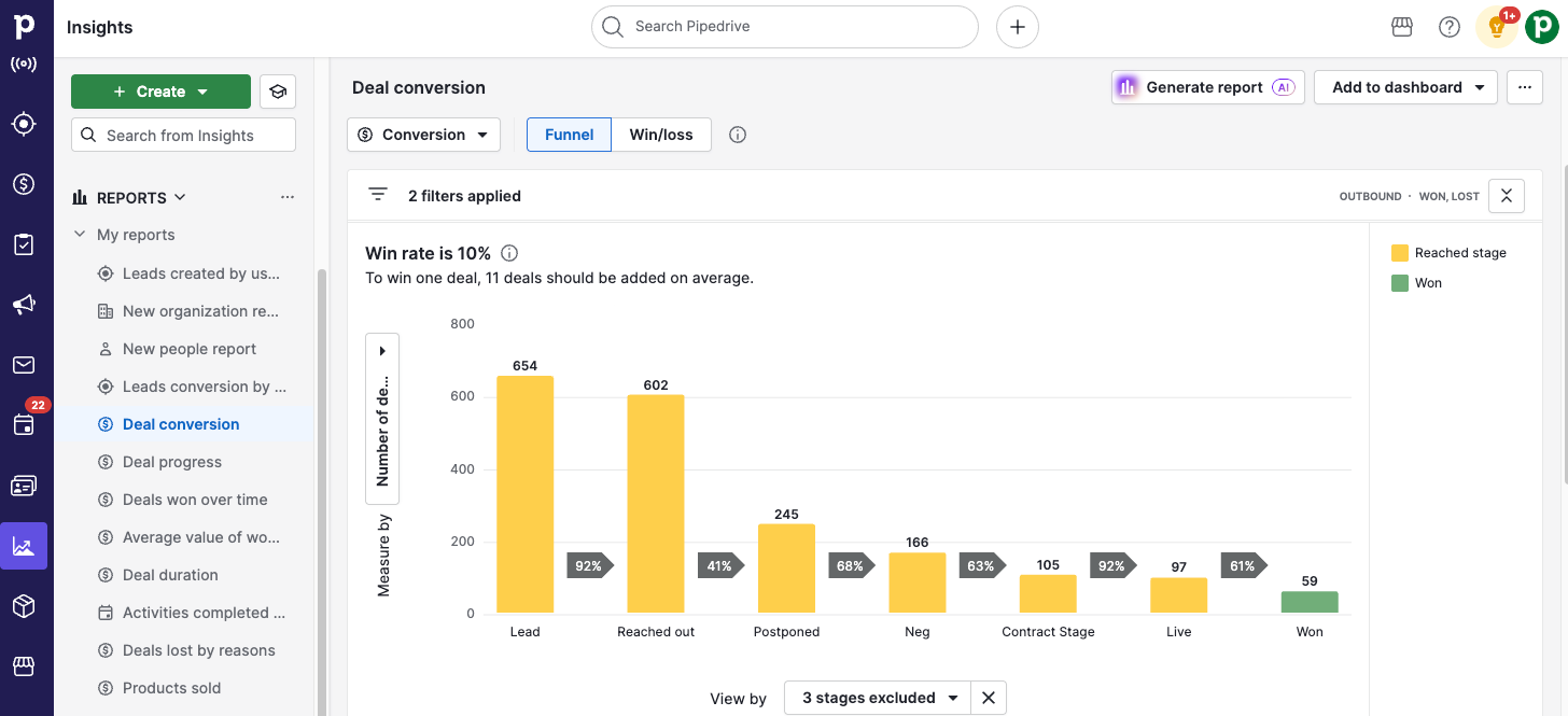 - Reporting and forecastingBuilt-in reporting shows conversion rates, expected revenue, and individual or team performance, which helps leaders make decisions based on actual pipeline data. Advanced plans unlock deeper analytics and forecasting features.