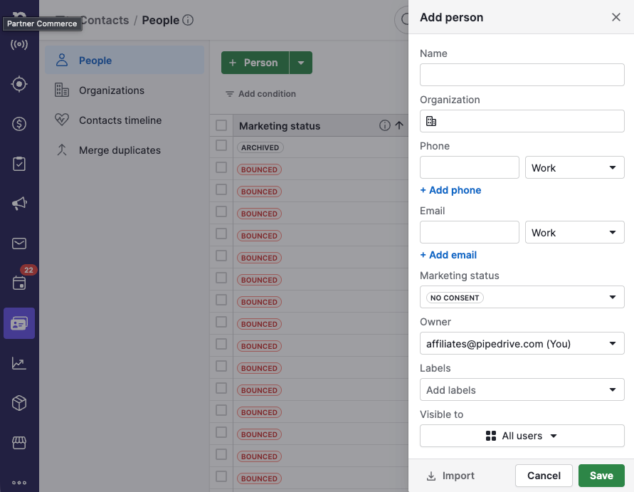 - Navigate to Contacts/People to create organizations and people records, then attach deals to them so every opportunity has clear context.