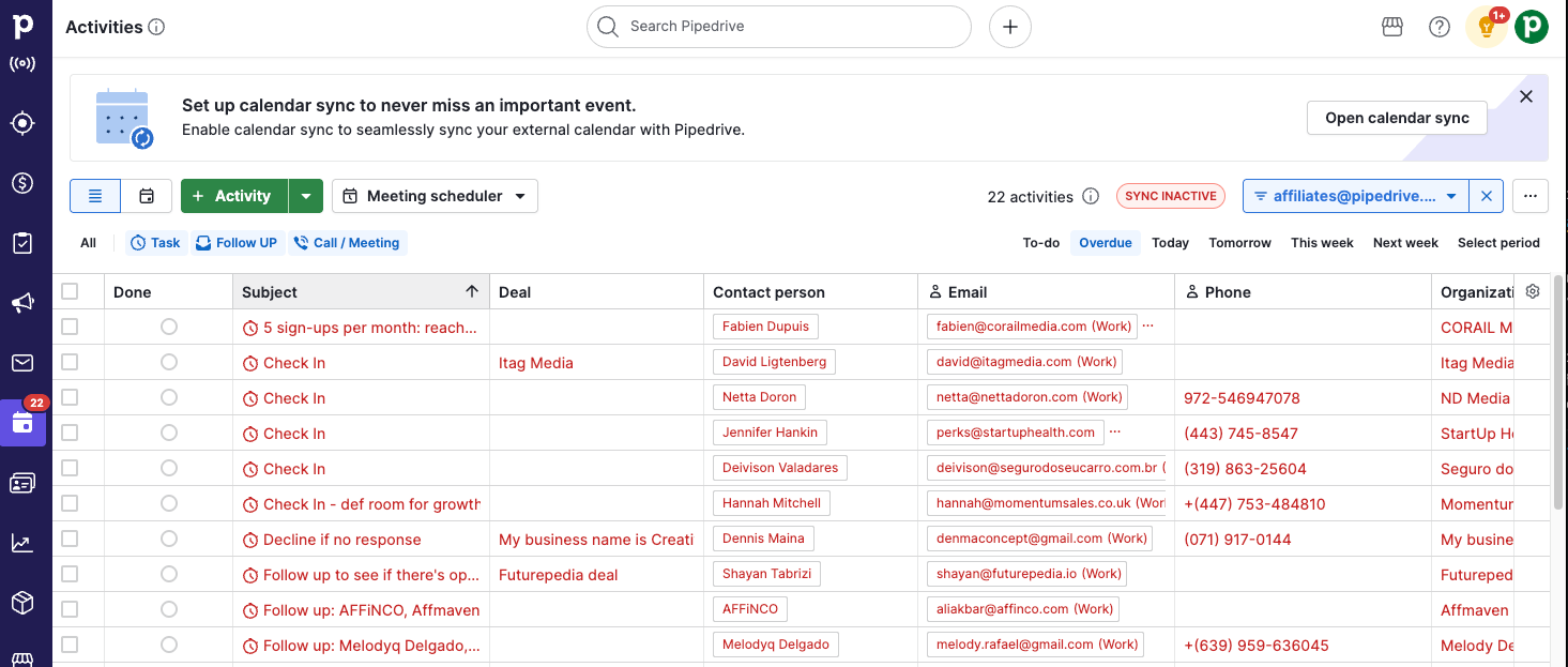 - Activity and calendar managementUsers can schedule calls, tasks, and meetings directly in Pipedrive and tie them to deals or contacts, reducing the risk of missing follow-ups. Calendar views and activity lists give a clear picture of what needs attention each day.