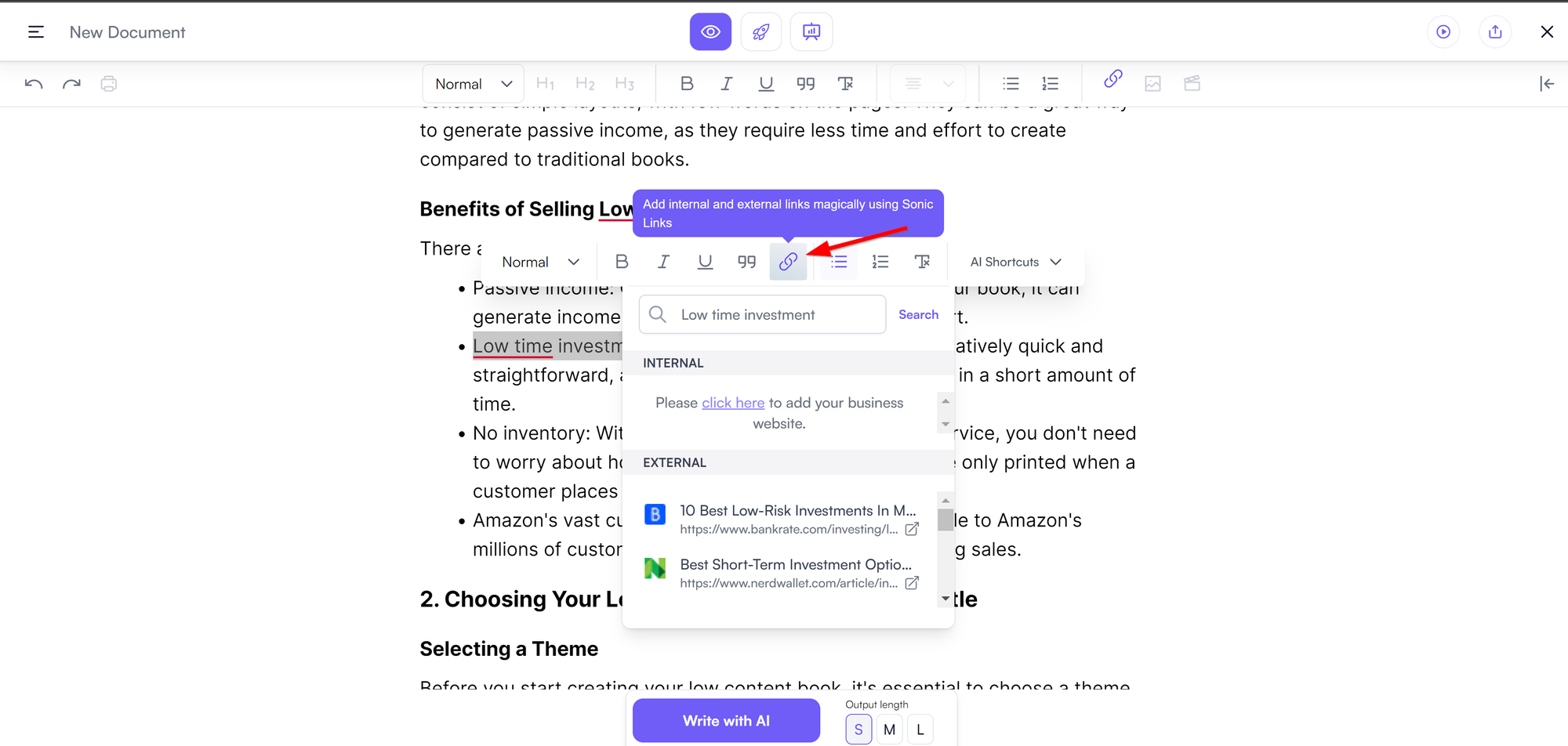 Opening the content in the Sonic Editor allows you to format, edit and enhance the content as required. In particular, I really liked the feature that allows you to insert or internal and external links using AI. Using this feature, you can highlight any text in the article and receive internal and external link suggestions for it.