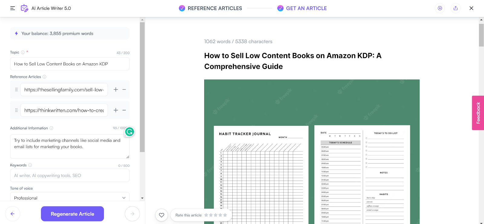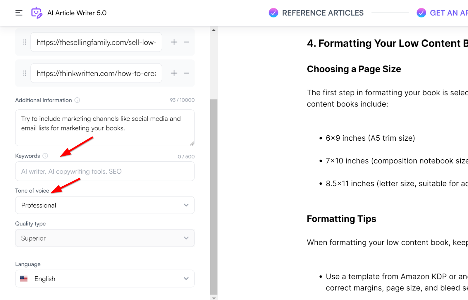 In the example below, I gave it the following topic: How to Sell Low Content Books on Amazon KDP and only selected 2 competitors that each had around 1500 words of content.
