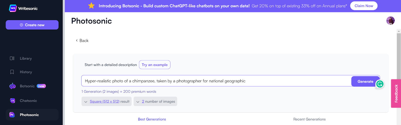 Now, let’s talk about Photosonic, which arguably, sets this tool apart from the competition. While most AI writers focus on written content only, Writesonic also helps you generate images using AI. You can simply offer this tool a written input and it creates different versions of AI-generated images for you.