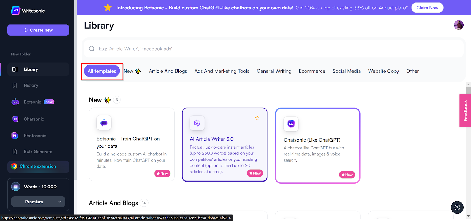 - Content Templates: Writesonic includes a wide selection of pre-designed templates for various purposes, making it easy to create blog posts, social media content, email campaigns, and more.