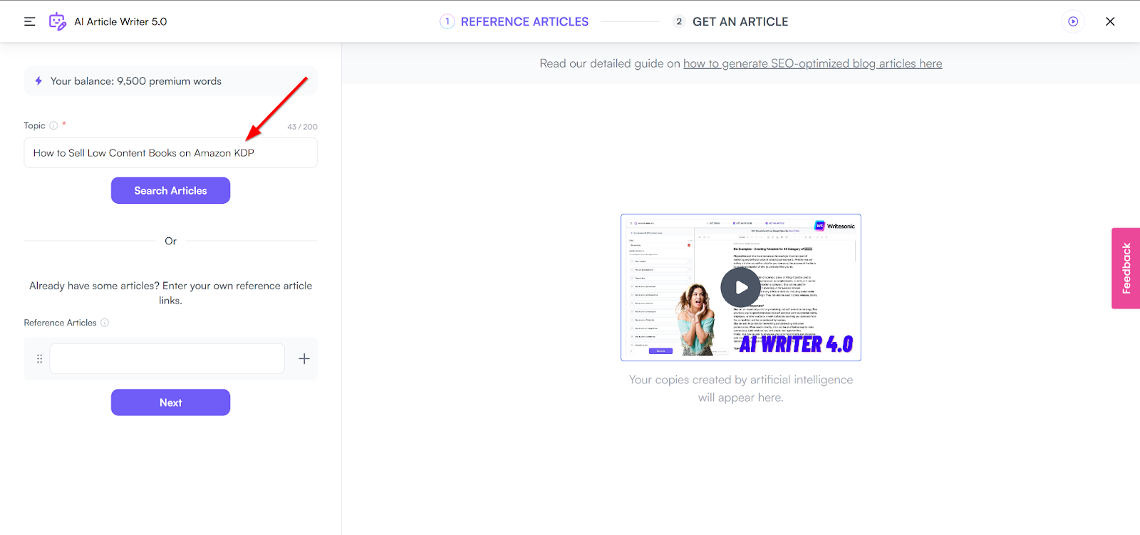 The AI writer generates content in 2 easy steps. In the first step, all you do is provide the title of your article and Writesonic finds reference articles for it from the Internet.