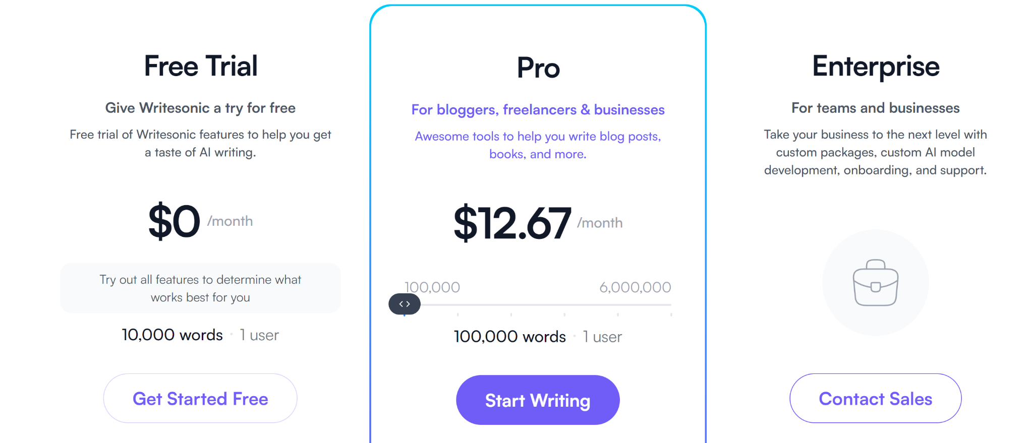 Writesonic has a slightly confusing pricing structure. On the face of it, they have 3 plans: Free trial, Pro and Enterprise. Most people use Writesonic with a pro plan.