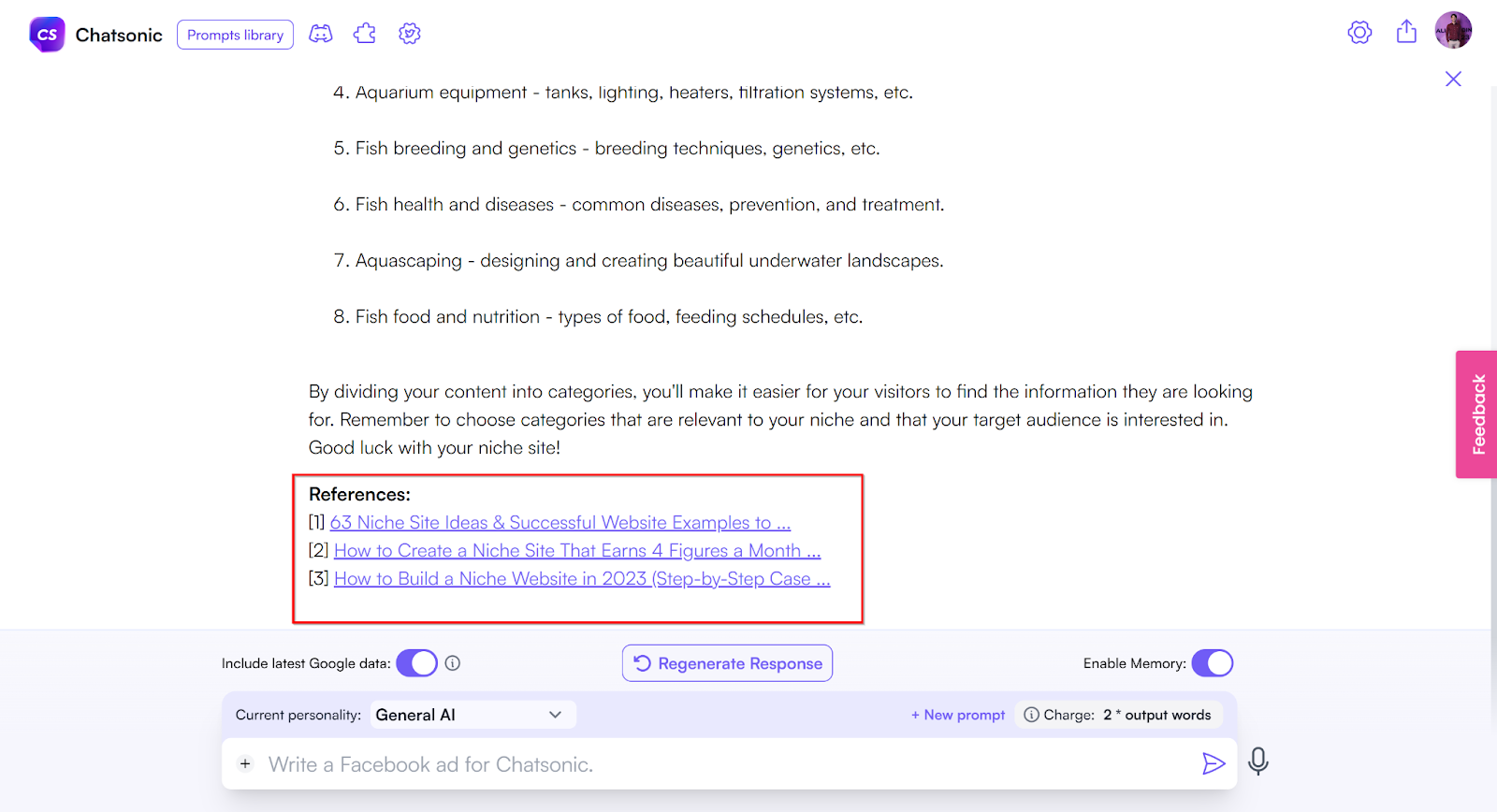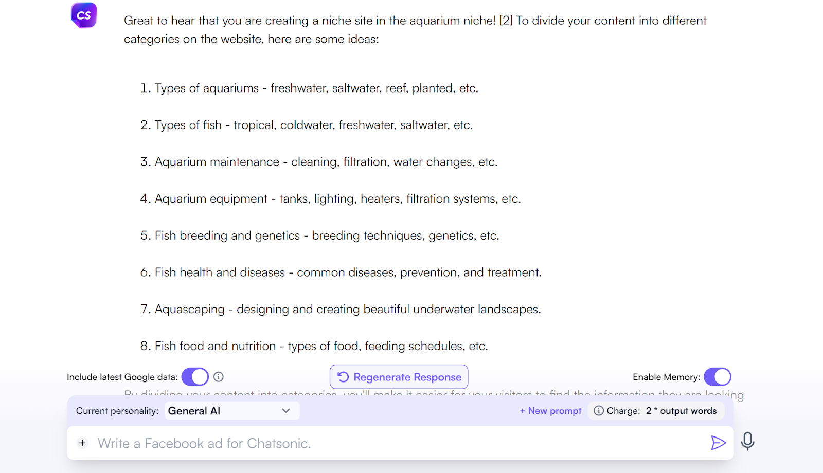 You get some great results from the chatbot for tasks that require intensive research. In the below example, I instructed Chatsonic that I’m starting a new website in the aquarium niche and asked for a list of topics/categories that I should divide my blog posts into.